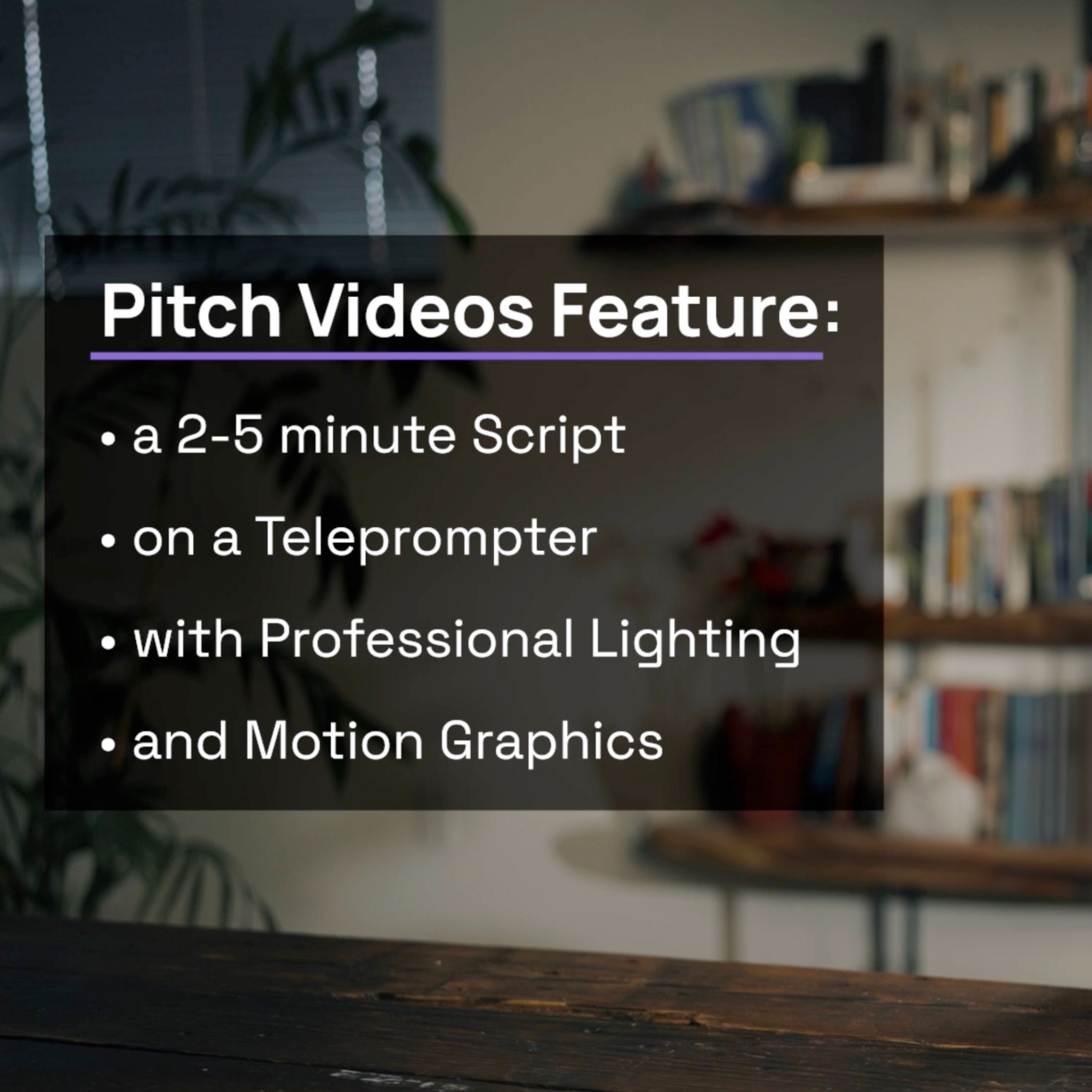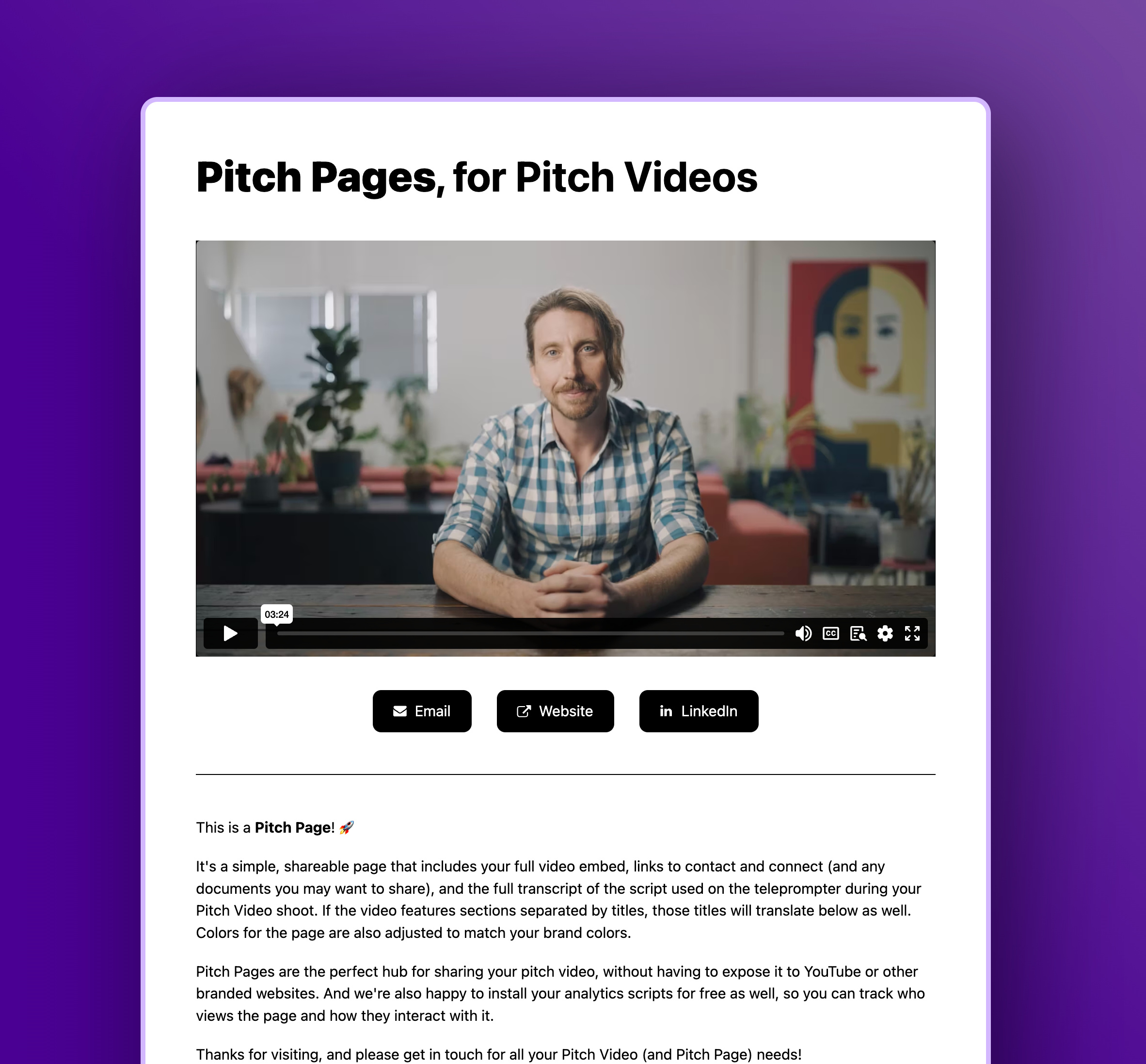 Each Pitch Video includes a https://YourCompanyName.Pitch.Page URL that features your video, links to get in touch, and the full transcript of your script, perfect for easily sharing with folks.